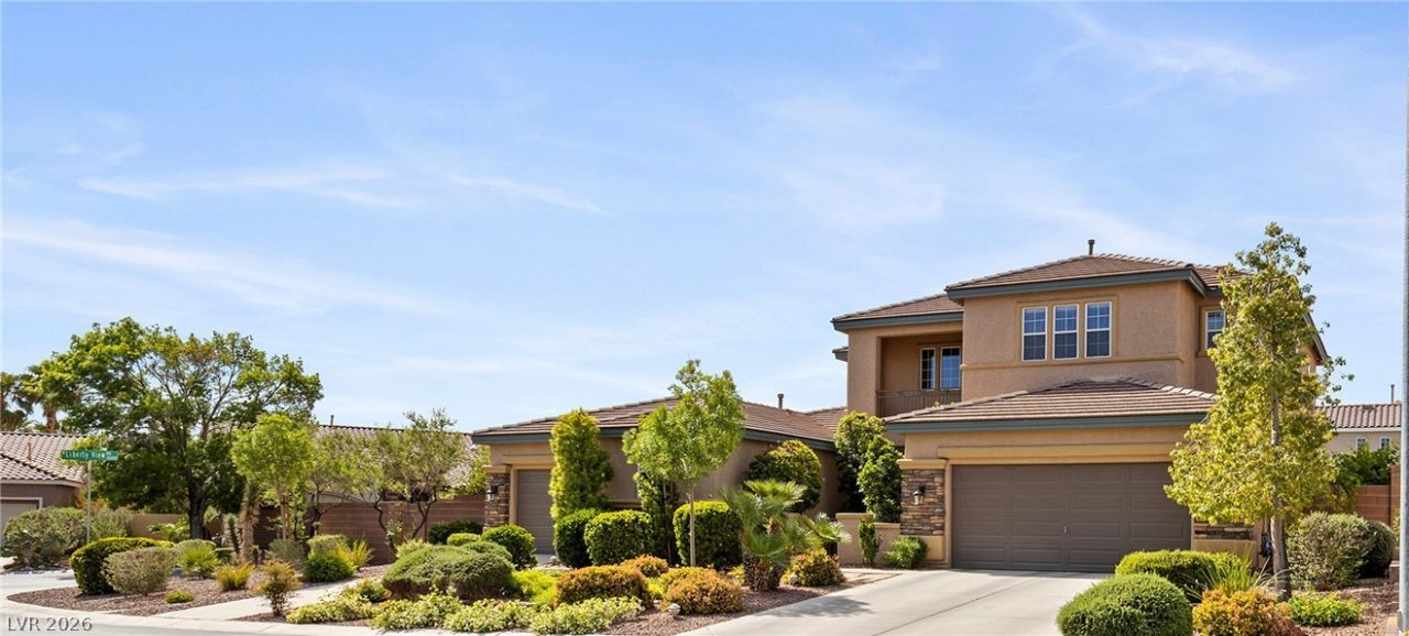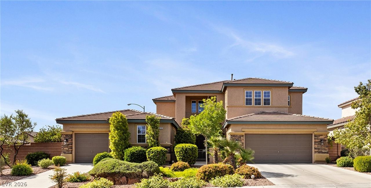 Located in the gated Southern Terrace community, this nearly 3,500 sq ft two-story home offers 5 bedrooms & 5 full bathrooms. Functional layout includes primary suite on the first floor plus an additional bedroom and full bath downstairs. Upstairs features a junior primary suite with city and Strip views, two additional bedrooms & a spacious loft with it's own full bath. Interior includes new travertine flooring on the first floor of the home. Kitchen opens to main living spaces. Recent updates include three A/C units. Exterior includes a 3-car garage, mature landscaping, fruit trees, and grape vines. Southern Terrace amenities include a clubhouse, multiple pools, spa, outdoor seating areas, BBQ areas, and playground. Located minutes from Bishop Gorman, parks, shopping, dining, and 215 access.