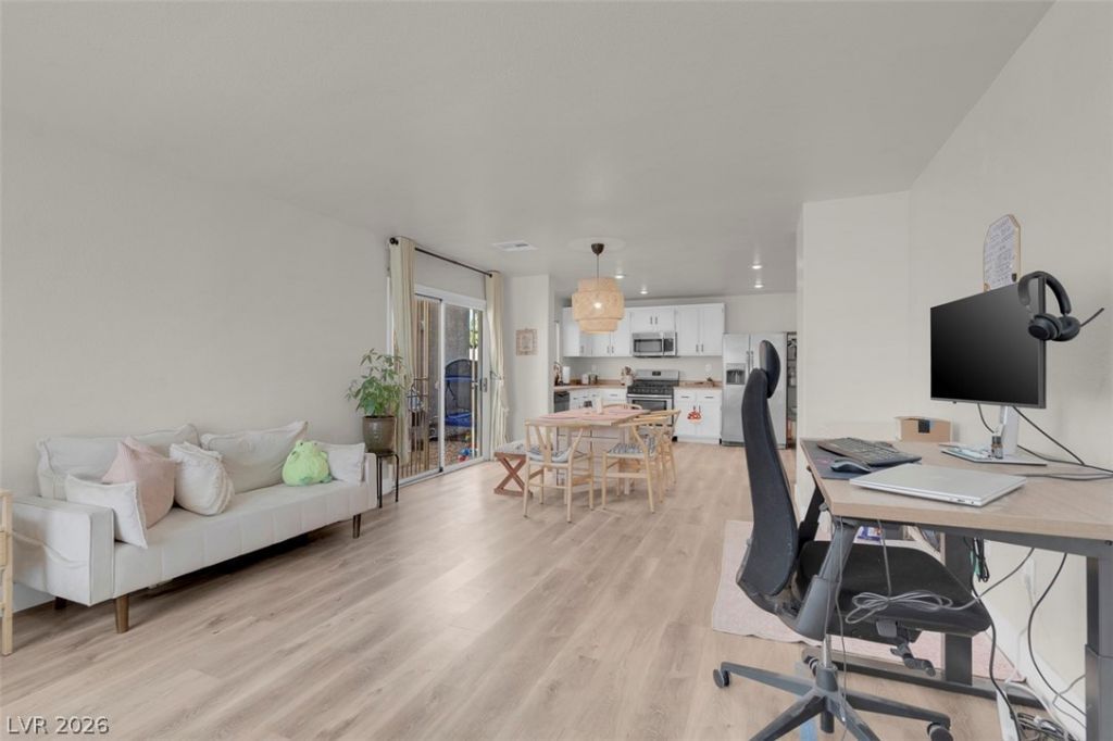 Charming and updated two-story home featuring a bright, open-concept layout and modern finishes throughout. The main living area offers durable luxury vinyl plank flooring, seamlessly connecting the living, dining, and kitchen spaces, perfect for everyday living and entertaining. The kitchen has been refreshed with white cabinetry, stainless steel appliances, and warm butcher block-style countertops. Upstairs, spacious bedrooms provide plenty of natural light and comfortable living, including a well-sized primary suite. Enjoy a low-maintenance backyard with artificial turf, gravel landscaping, and space to relax or entertain. The side yard adds extra functionality for pets, play, or storage. Conveniently located near shopping, dining, and major roadways, this move-in-ready home offers both comfort and value.